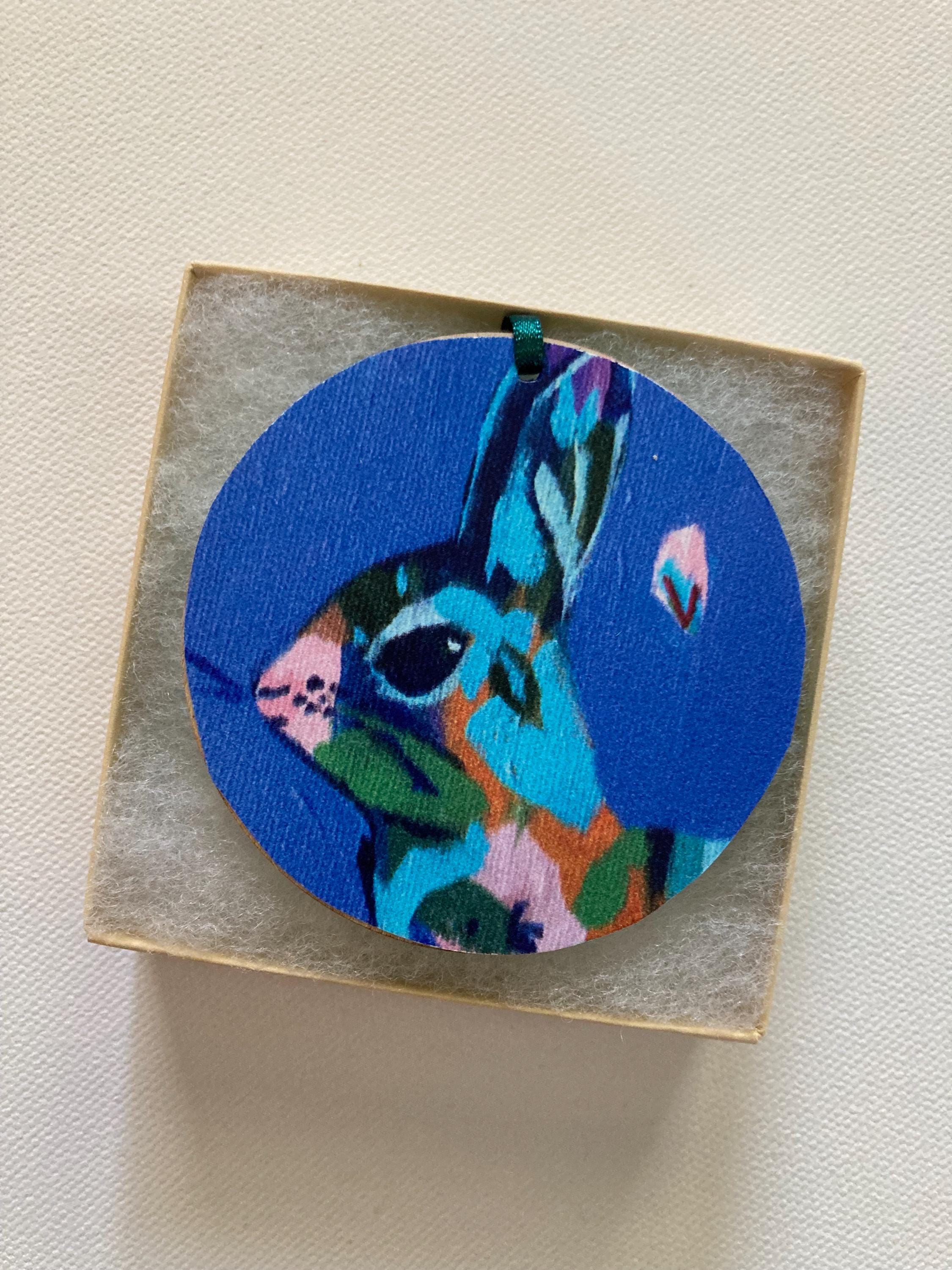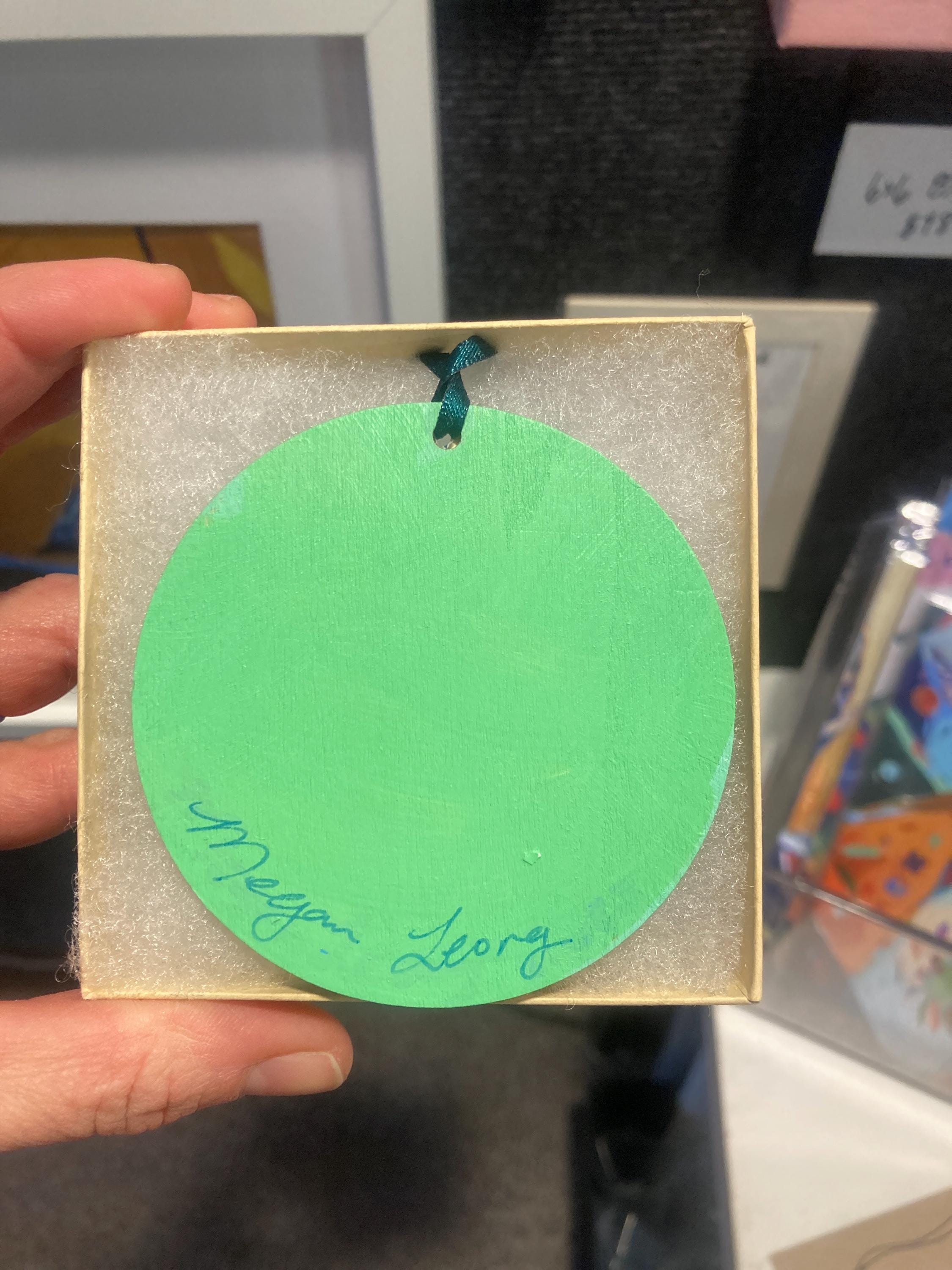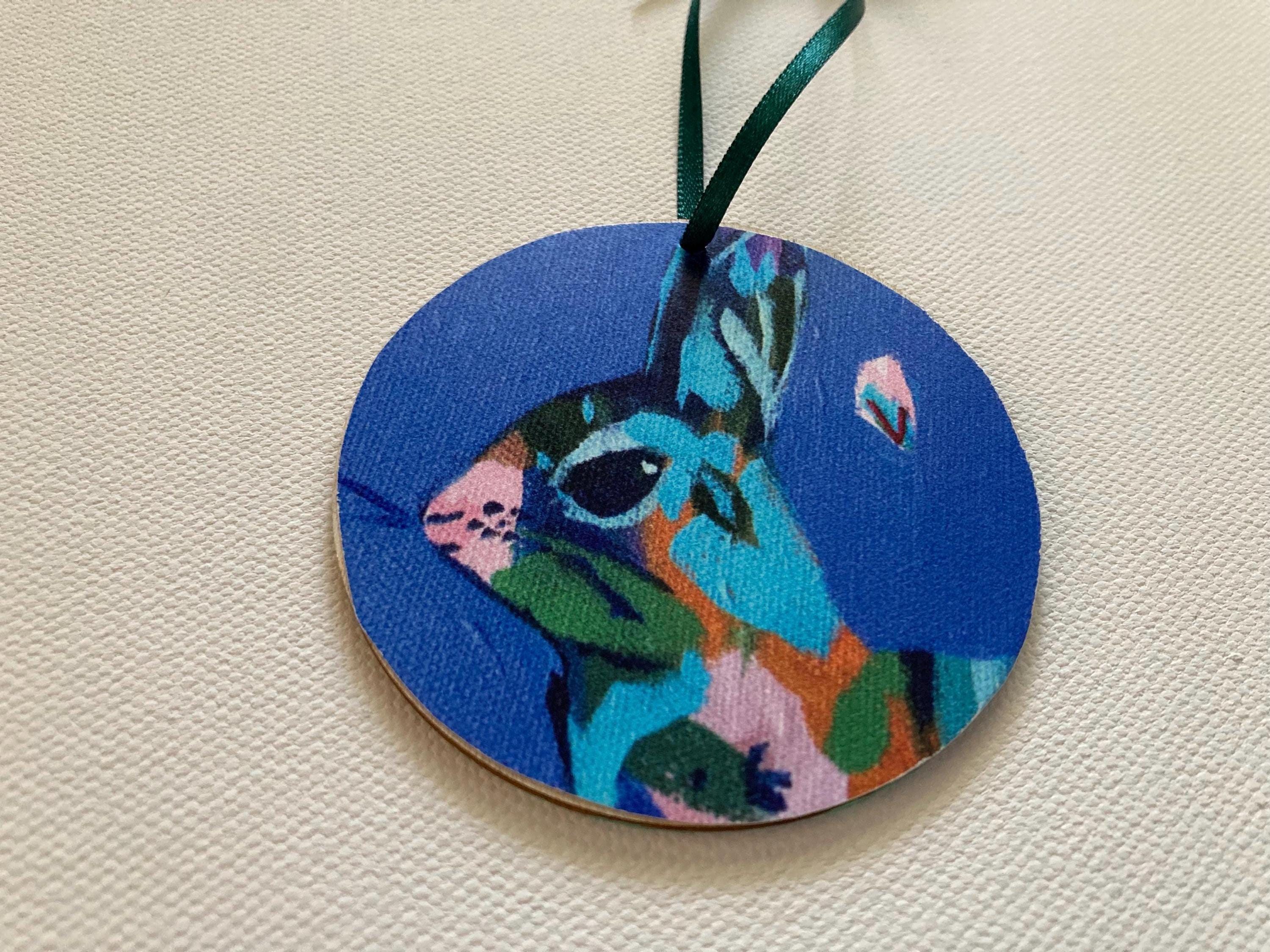 Ornaments feature an archival quality art print on the front side and are hand painted and signed on the back. Each ornament comes packaged in a gift box.