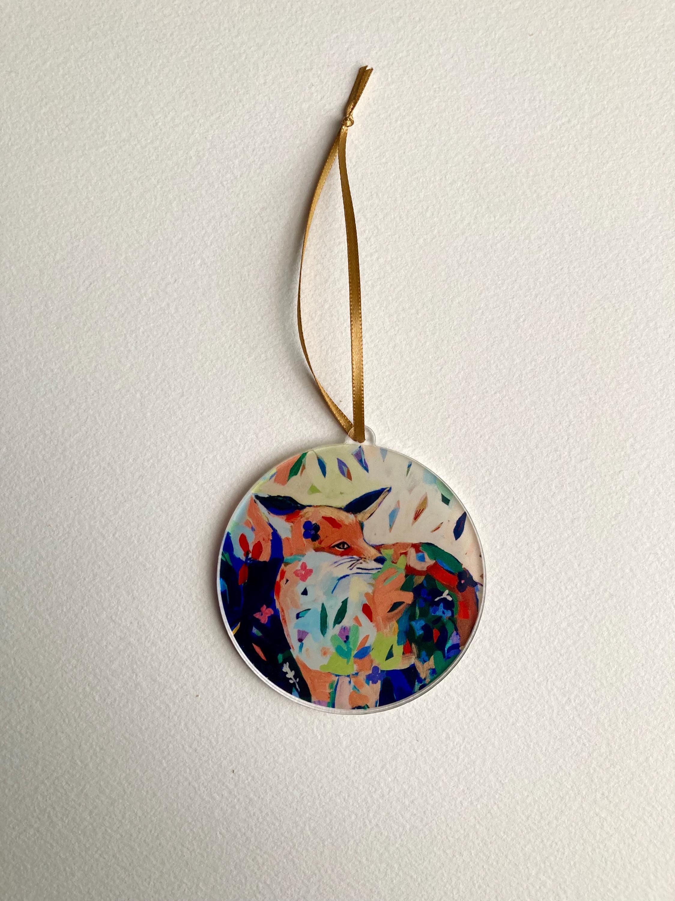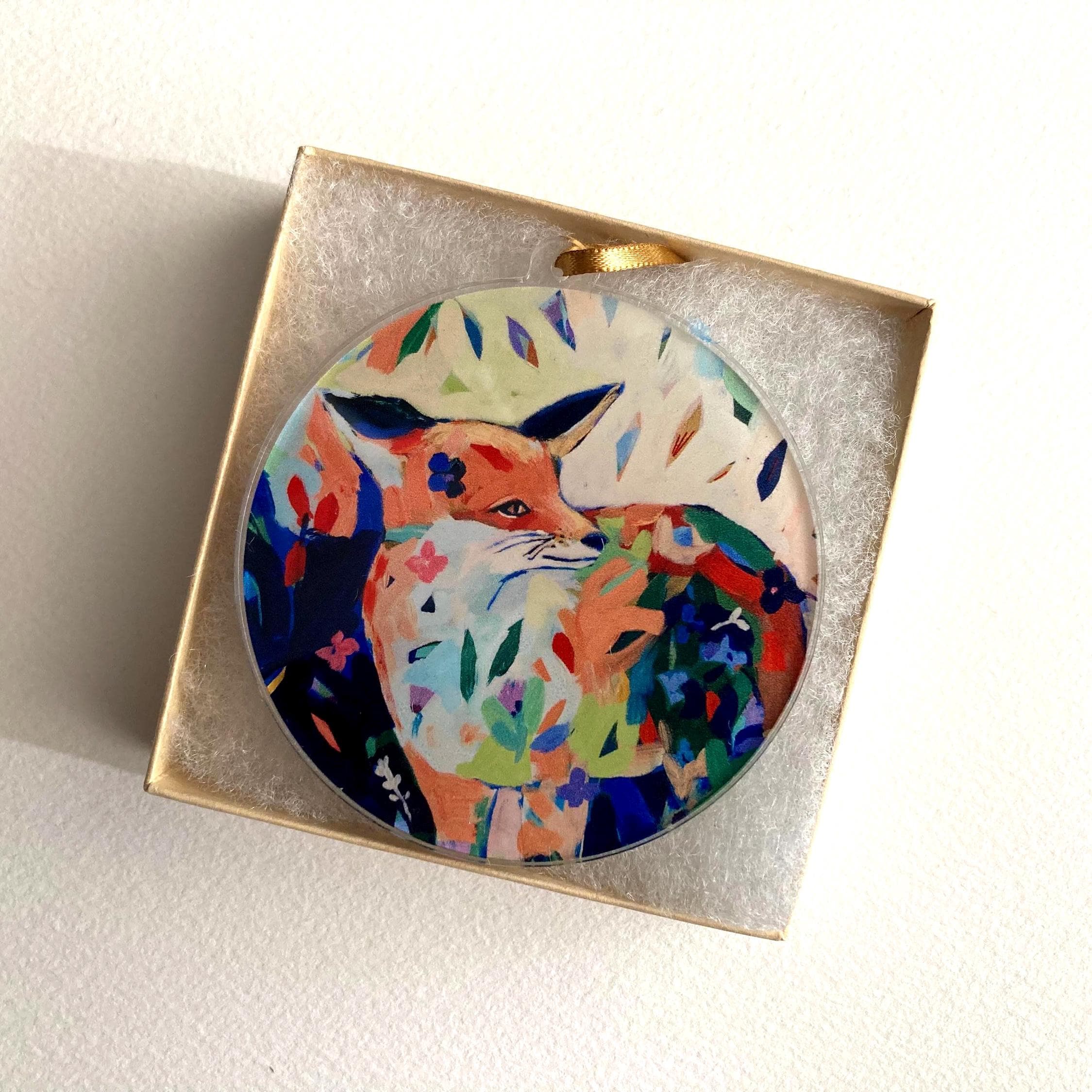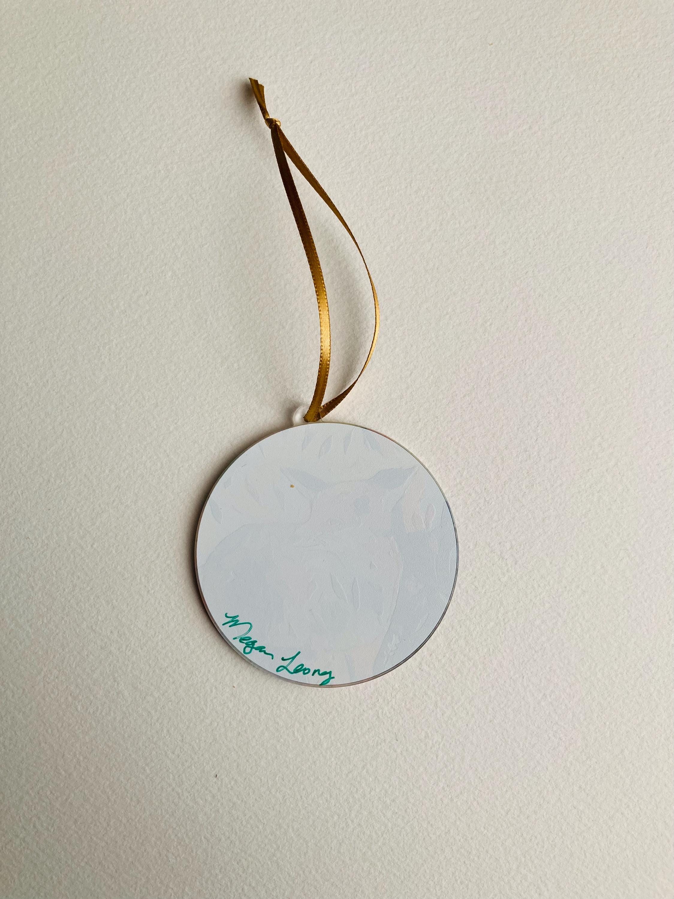 Ornaments feature an art print on the front side and are hand signed on the back. Each ornament comes packaged in a gift box.